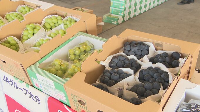 糖度が高く県内では宇佐市安心院町を中心に栽培されているシャインマスカットとピオーネ。4日は、大分市の公設地方卸売市場で生産者らが旬入りを宣言したあと、初競りが行われました。