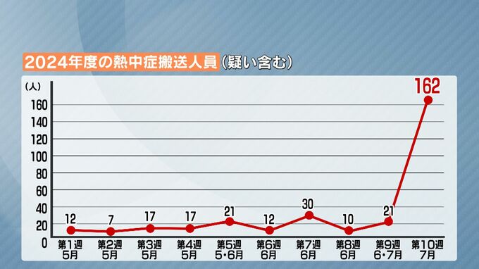 県のまとめによりますと、7日までの1週間、熱中症で搬送されたのは162人にのぼり前の週の21人から急激に増加。このうち、高齢者3人が亡くなっています。