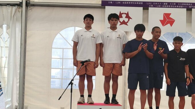 カヌー男子カナディアンペア200メートル決勝は、大分県豊後高田市の真玉B&G海洋センターで行われ、高田高校の沢田と小串ペアは、42秒102で全国の頂点に立ちました。