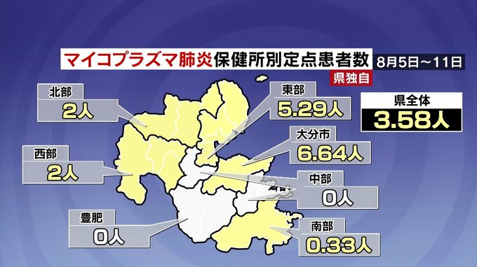 県独自調査の保健所別の定点患者数は大分市が6.64人で最も多く、東部が5.29人、北部と西部が2人と続いています。