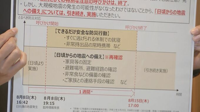 南海トラフ地震臨時情報の巨大地震注意は8月8日に起きた日向灘の地震を受けて初めて発表されました。気象庁は発表から1週間程度県内を含む対象地域に地震への備えを再確認するよう呼びかけていました。