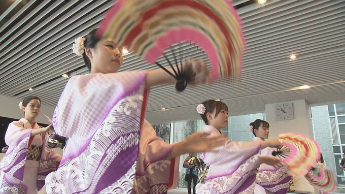 8月24日に開催される「津久見扇子踊り大会」を前に、祭りのPR隊が19日、OBS本社を訪れ優雅な舞を披露しました。