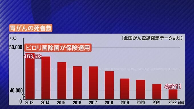 日本では2013年からピロリ菌の除菌が保険適用になりました。以降、胃がんによる死者数は減少しています。