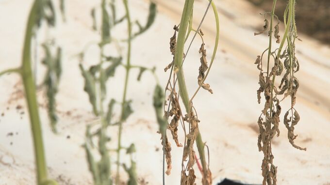 「こちらがトマトの今の状況です、3分の1くらいが高温で枯れています。トマトやキュウリを40年にわたり作っているけど、定植したあと、暑さで枯れるのは初めての経験」