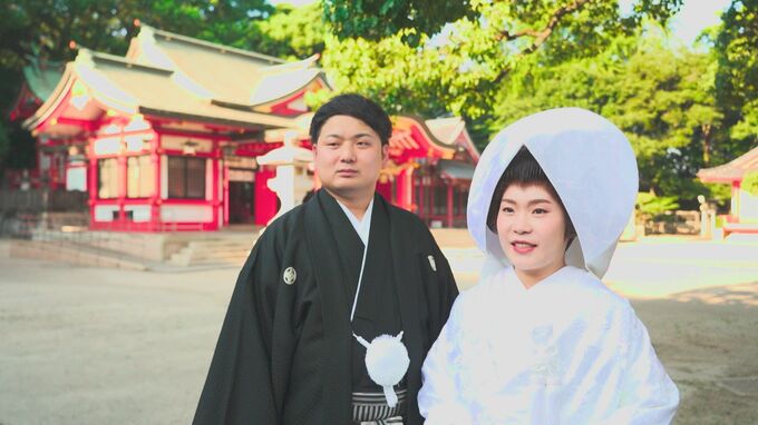 樹齢千年のクスノキが見守る大分市の春日神社。快晴の下、1組の夫婦が挙式前の撮影に臨んでいました。新郎・室田竜也さん(27)と新婦・海音さん(24)です。