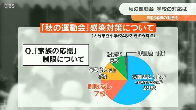 大分市では公立小学校54校のうち48校が9月から10月にかけて運動会を行います。OBSでは48校に対し、運動会の運営についてアンケートを実施しました。スケジュールについては、回答のあった47校が時間を短縮して昼食をとらない「午前中開催」としています。家族の応援については、「保護者2人まで」とする学校が最も多く29校、「人数制限なし」7校、「家族3人~6人」6校でした。また、声出し応援については「応援団のみ」が34校、「すべての児童」が7校となっています。また、玉入れなどの団体競技を3年ぶりに復活させる学校もありました。