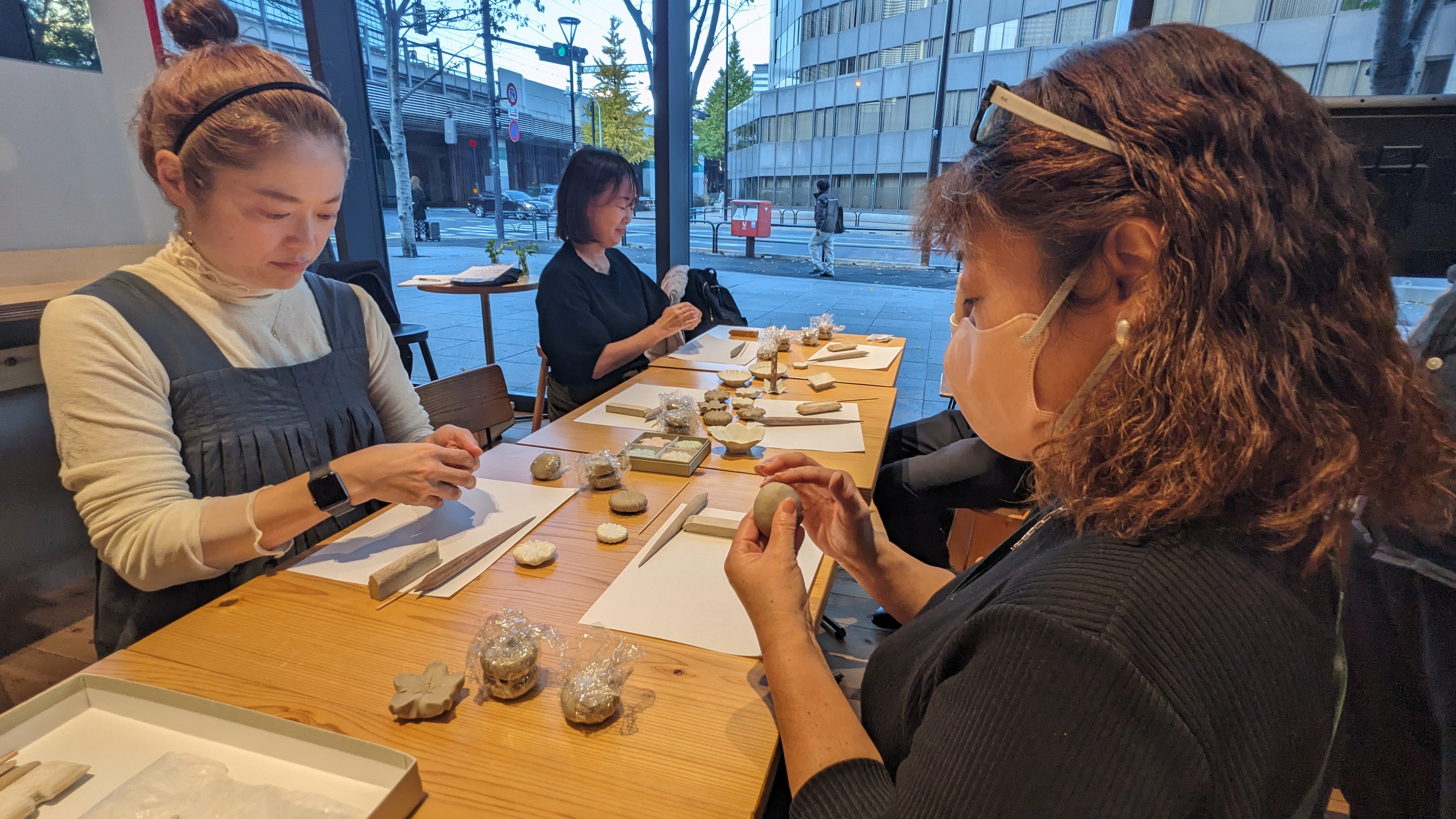 この日、臼杵焼作りが体験できるワークショップが開催され、事前予約した10人が参加しました。宇佐美さんは菊や桜の形をした箸置きの作り方を教えながら、臼杵市の歴史や文化、観光情報を紹介し、参加者との交流を楽しみました。