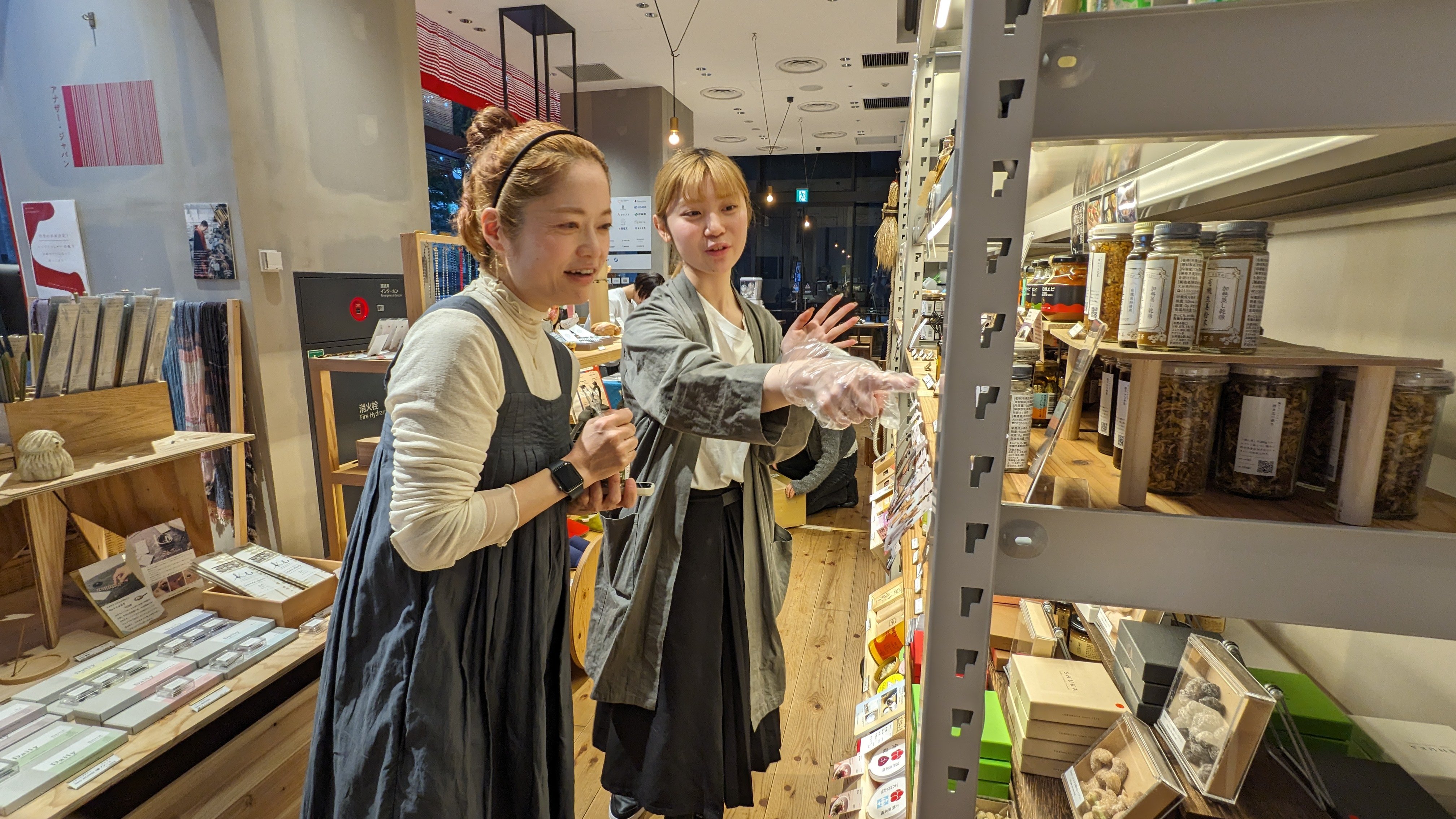 ワークショップ終了後、宇佐美さんは参加者に対して、うすきフェアで売られている商品の特徴を詳しく案内して、堀さんの活動をサポートしました。
