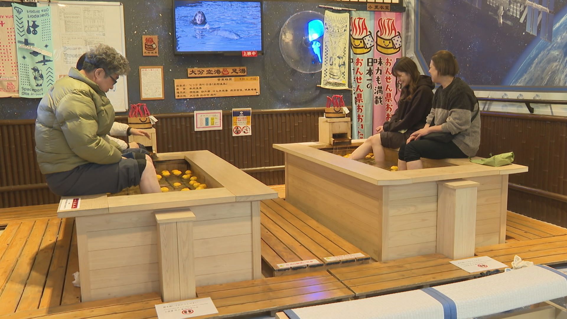この取り組みは、宇佐柚子生産組合などが2019年から毎年この時期に行っています。21日の冬至を前に大分空港1階の足湯には宇佐市院内町産のゆず約100個が浮かべられました。