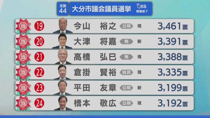 【開票速報】大分市議会議員選挙2025 定数44に54人が立候補 現職34人、元職2人、新人18人の争い 激戦の行方は?