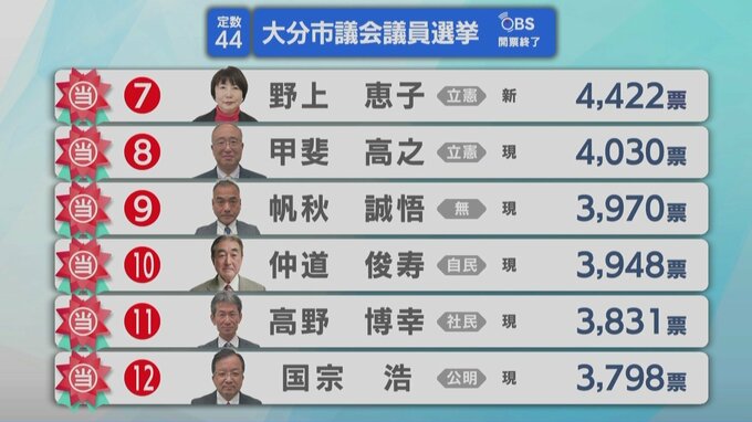 大分市議選44人の顔ぶれ決まる 国民民主が初議席、最多得票で当選