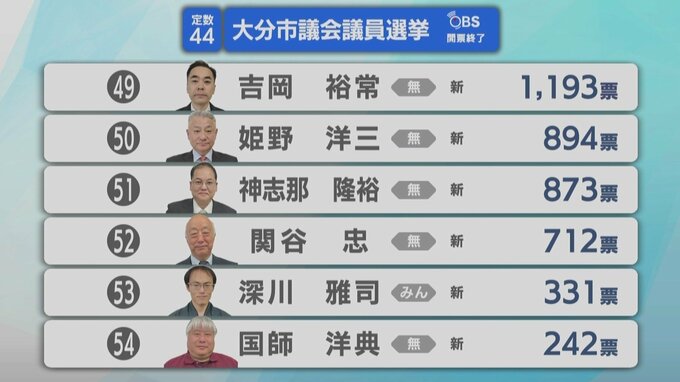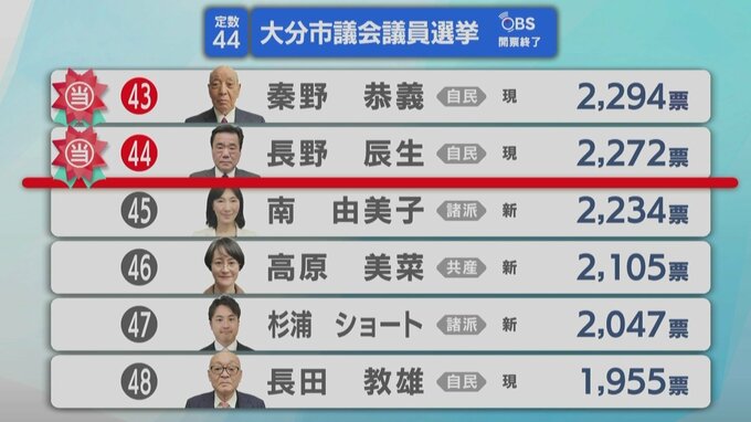 大分市議選44人の顔ぶれ決まる 国民民主が初議席、最多得票で当選