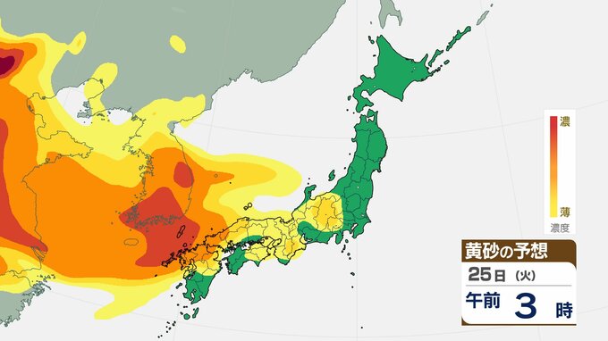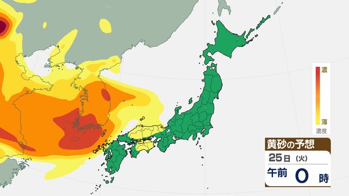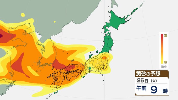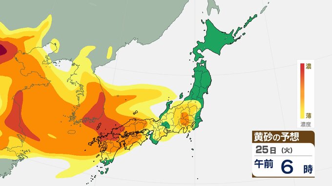 【黄砂情報】九州から関東、東北にかけて25日は黄砂飛来のおそれ 交通障害に注意【黄砂予想シミュレーション】