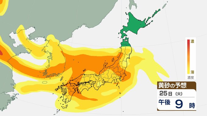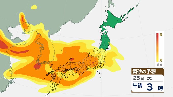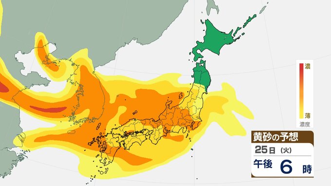 【黄砂情報】九州から関東、東北にかけて25日は黄砂飛来のおそれ 交通障害に注意【黄砂予想シミュレーション】