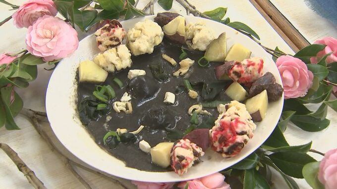 そして、坊主地獄をイメージした料理は、ワカメや豆腐が入った黒ゴマのみそ汁の中に、お饅頭が置かれています。