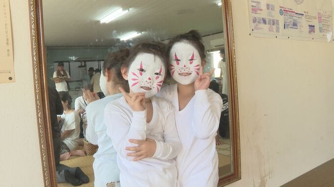 地元の子どもたちは準備に大忙し!顔を真っ白に塗ってもらい、目とほほには赤い線を入れて…子ギツネに変身です。