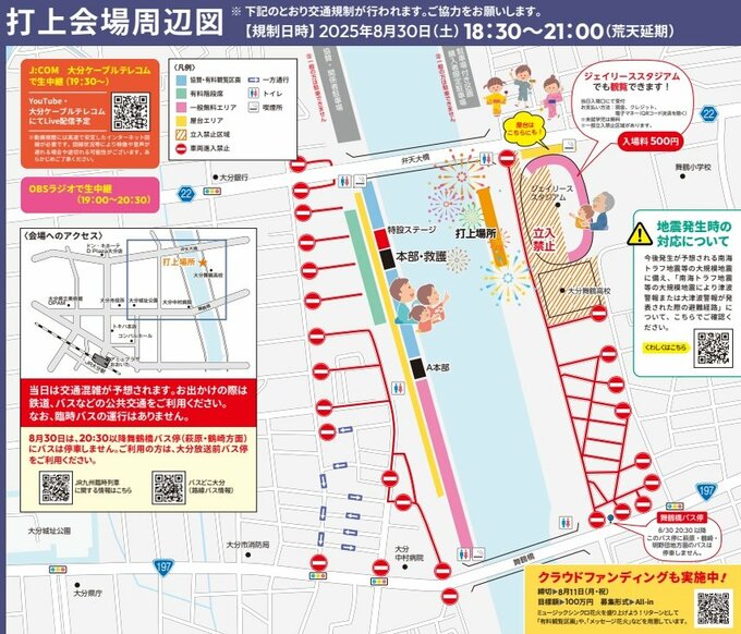 協賛特典区画・有料観覧区画・有料階段席・花火打上場所周辺・会場内通路を除く場所では、無料で観覧できます。ジェイリーススタジアム(大分市営陸上競技場)でも観覧(入場料500円)可能です。