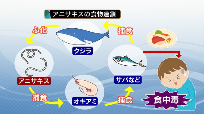 クジラなどの体内で卵を産むアニサキスは、その卵が海に出てプランクトンのオキアミから魚へと食べられます。この食物連鎖の中で人の体内に入り、食中毒を引き起こすのです。