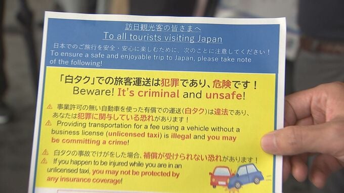 参加者は外国人観光客などに「白タク」が違法であることなど3か国語で説明したチラシを配り、利用しないよう呼びかけました。
