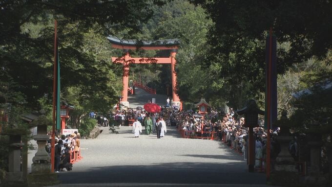 そして、6日、258回目となる「勅祭」が執り行われました。伝統の装束を身にまとった勅使らが天皇陛下からのお供え物を運びながら本殿へと向かいました。定期的に勅祭が行われるのは、全国で16社しかなく参道には貴重な祭事を見届けようと多くの人が詰めかけました。