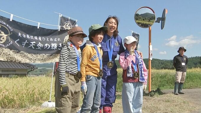 人工衛星を活用した大分県玖珠町の新ブランド米のアンバサダーに、オリンピック銅メダリストの小谷実可子さんが就任することになり、子どもたちと一緒に稲刈りを体験しました。