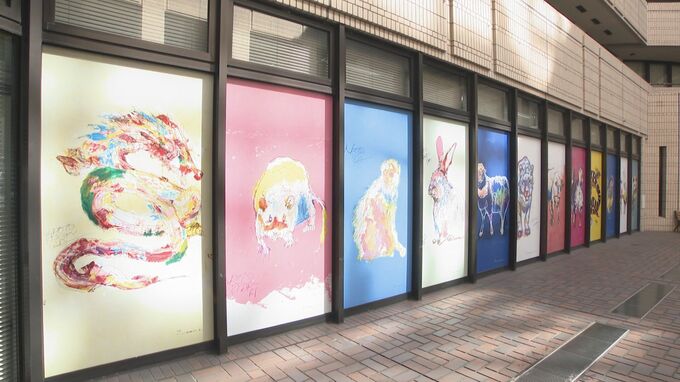 コンパルホールで見られるのは、画家の北村直登さんの作品「ひとめぐりのなかまたち」。干支の生き物が鮮やかな色合いで描かれています。