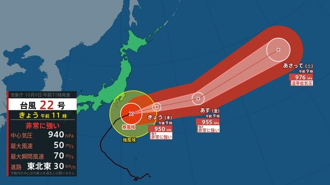 9日は日本の東を東北東へ進む見込みで、伊豆諸島南部では、9日11時までの24時間降水量が300ミリを超えるなど記録的な大雨となっており、土砂災害の危険度が非常に高まっている所があります。