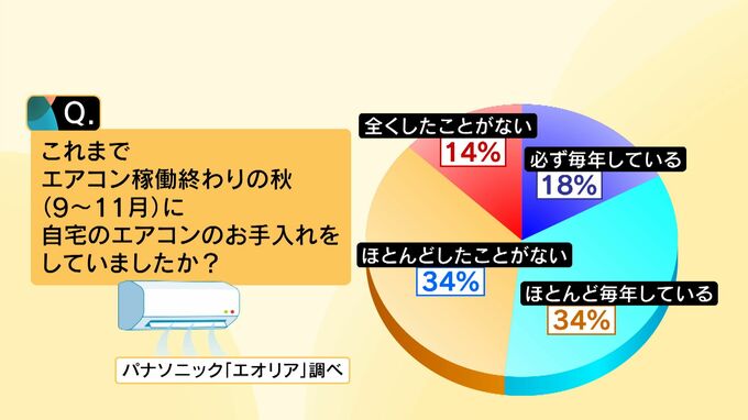 大手家電メーカー・パナソニックの調査では、冷房シーズンが終わる秋(9月~11月)の時点で「手入れをまったくしたことがない」「ほとんどしたことがない」と答えた人は48%に上りました。