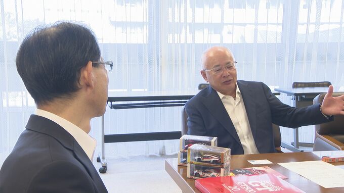 県庁を訪れたのは、国内最大級のモータースポーツとして知られるスーパーGTシリーズの関係者ら4人です。4人は日田市上津江町のオートポリスで行われるレースの見所を佐藤知事に伝え、大会の成功を誓いました。