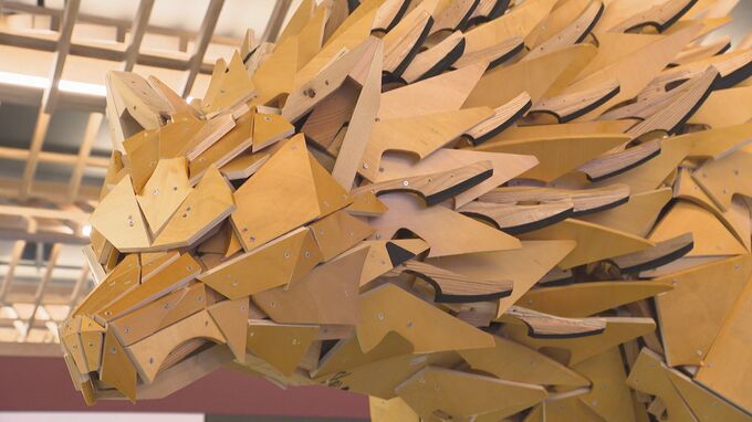 オオカミをイメージして作られた今回の作品は高さ2メートル、長さ3.6メートルの木製です。客室でかつて使用していた座椅子が主な材料として使用され、足の部分には釜めしのふたが活用されています。