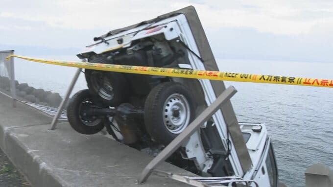 この事故で軽トラックは歩道を横切り、海側に設置されている柵を突き破って波消しブロックの上に転落しました。