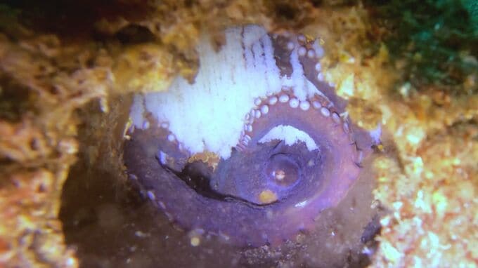 海に潜るとすぐにカンパチやハマチが目の前を泳ぐ光景が広がり、ゴンズイの群れを見ることもできました。また、海底にあった壺の中を覗くと、藤の花のように垂れ下がる卵を大切に育てるタコの姿が確認できました。