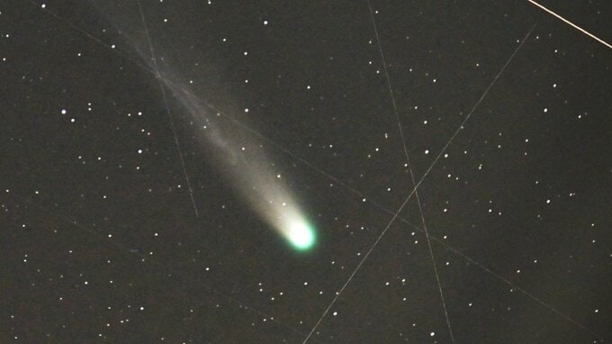 彗星には主に緑色と白色の2種類があります。肉眼で見る場合、彗星自体はそれほど明るくないため、鮮やかな緑色には見えず、ほのかに緑がかって見える程度です。しかし、写真では淡い光を蓄えることができるため、見た目以上に色鮮やかに写すことが可能です。