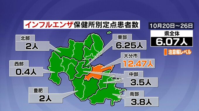 患者数の増加は3週連続です3週連続です。保健所別では大分市が12.47人と注意報基準の10を上回りました。また、西部を除くすべての地域で流行期入りの基準となる1を超えています。