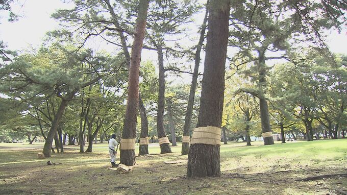 立冬を前に冬支度です。別府公園では4日、害虫から松の木を守る恒例の「こも巻き」が行われました。