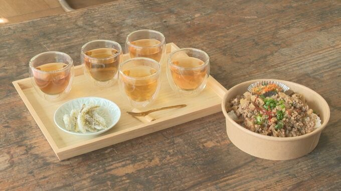 この日は、荒廃した竹林でとれたタケノコをたっぷり使った鹿肉の担々丼や、かつて養蚕が盛んだった地域の桑の葉を使った米粉ケーキなどが振る舞われました。また、ドクダミやスギナ、オオバコなど、日本の里山ならではの野草で作ったブレンド茶とケーキの試食会も行われました。