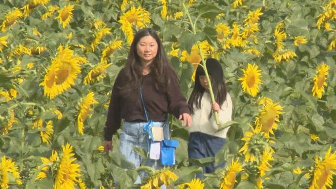 (訪れた人)「コスモスとヒマワリがきれいでした」「これだけの広さというのはなかなか見られませんね」「秋に見られるのは圧巻ですし、コスモスとの融合がすごくきれいで、きょうはとってもうれしい気持ちでいっぱいです」