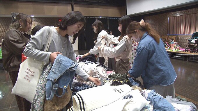 会場には子供服やおもちゃなど、およそ3500点がサイズや用途ごとに並び、訪れた保護者たちが子どもに似合うものを品定めしていました。