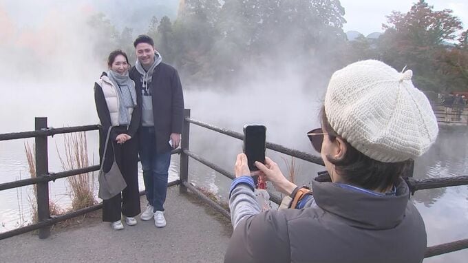 大分県内は放射冷却現象の影響で、11日未明から明け方にかけて気温が下がりました。各地の最低気温は、由布市湯布院町でマイナス0.4度、玖珠町で0.7度、大分市で7.7度と、ほとんどの地域で今季一番の冷え込みとなりました。初の氷点下を観測した湯布院の金鱗湖周辺では散策する人の姿が見られました。
