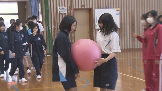 18日の授業では、中学生が2人1組となり、手を使わずにボールを運ぶトレーニングに挑戦。楽しみながら体の正しい使い方を学んでいました。