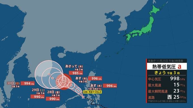 気象庁によりますと25日午後3時、熱帯低気圧はスル海(北緯10度35分、東経121度00分)に位置し、西へ時速25kmで進んでいます。中心気圧は998hPa、中心付近の最大風速は15m/s、最大瞬間風速は23m/sとなっています。