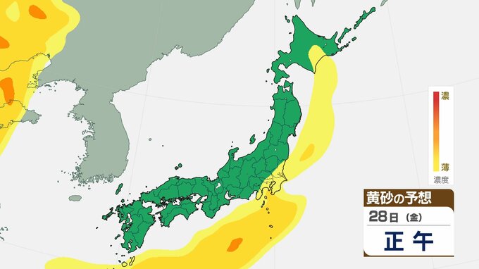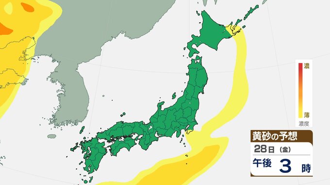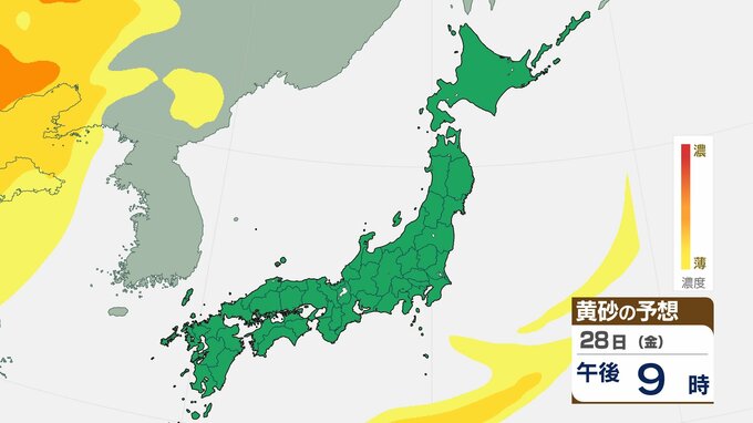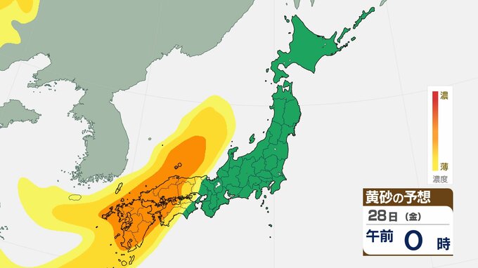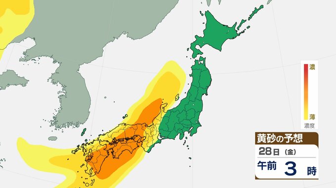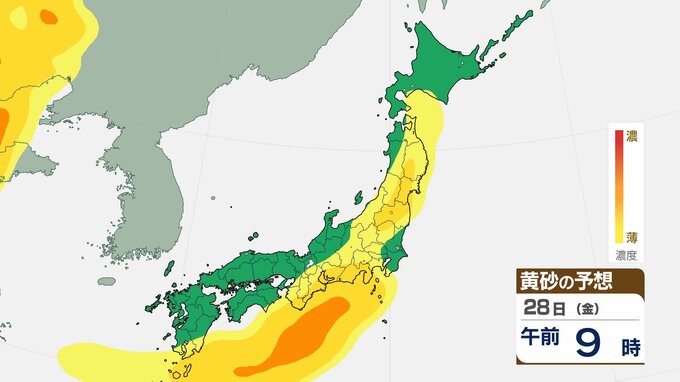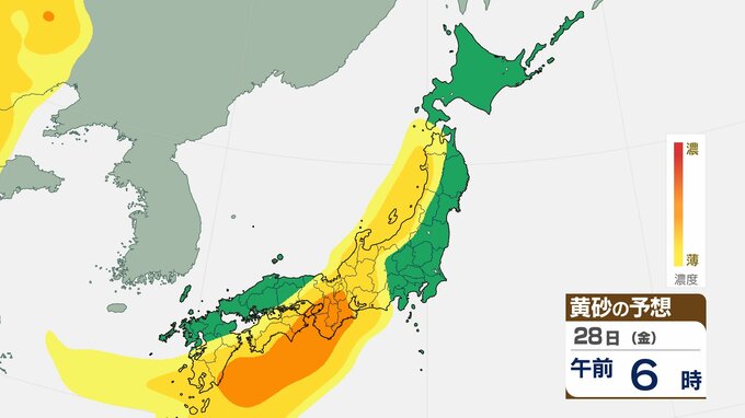 【黄砂情報】27日午後から28日にかけて西日本・東日本の広範囲に黄砂予想 視程悪化や交通影響のおそれ【27日~30日までの黄砂シミュレーション】
