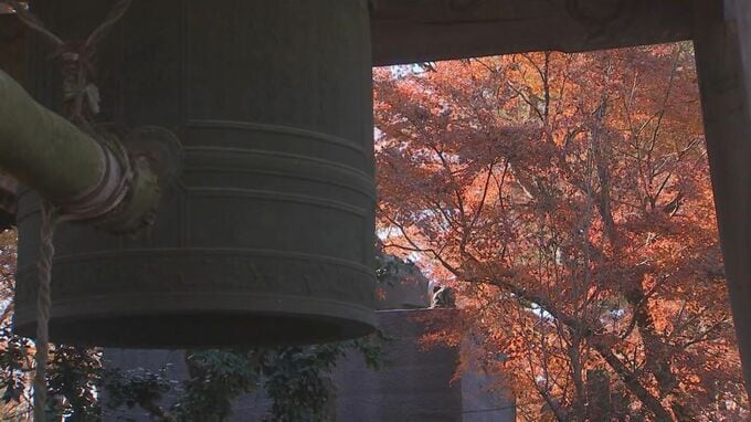 28日は風が冷たい一日となりましたが、すっきりとした青空に赤く色づいたモミジが映えていました。訪れた人は境内を散策し、紅葉狩りを楽しんでいました。