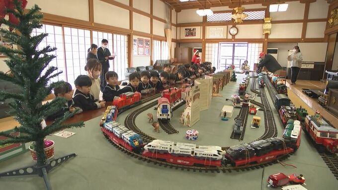 本堂には全長50メートルの線路が設置され、サンタや人気キャラクターなどのフィギュアを載せた合計55両の列車が走行。園児たちは目の前で動く列車に夢中になり、鉄道の世界を楽しんでいました。