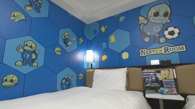 また、大分ならではの特色として、芝生のようなじゅうたんと、サッカーチーム「大分トリニータ」のマスコット・ニータンが出迎える「ニータンルーム」が2部屋用意されています。青い壁とサッカーグラウンドを模したじゅうたんに囲まれた、ファンにはたまらない部屋です。