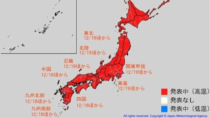 気象庁は11日午後、北海道・東北・関東甲信・北陸・東海・近畿・中国・四国・九州北部(山口県含む)・九州南部 奄美地方にかけての広い範囲に「高温に関する早期天候情報」を発表しました。18日頃から寒気の影響を受けにくくなるため、全国的に平年より気温が高くなる見込みで、農作物の管理などに注意を呼びかけています。