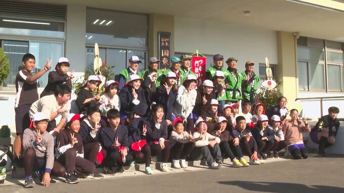 3校が統合して初めての新年を晴れやかな気持ちで迎えてもらおうと、18日、地元の門松保存会から7人が参加して正月の縁起物作りが行われました。竹や梅、ナンテンなどを使った高さおよそ1.8メートルの門松は2時間ほどで完成し、子どもたちに披露されました。