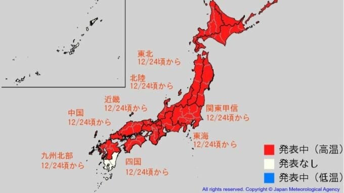 気象庁は18日午後、北海道・東北・関東甲信・北陸・東海・近畿・中国・四国・九州北部(山口県含む)にかけての広い範囲に「高温に関する早期天候情報」を発表しました。24日頃から寒気の影響を受けにくくなるため、全国的に平年より気温が高くなる見込みで、農作物の管理などに注意を呼びかけています。