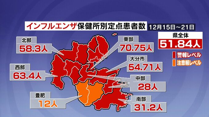 保健所別では別府市などの東部が最も多く70.75人で西部が63.4人、北部や中部も前の週から感染が拡大しています。