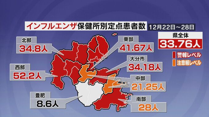 年末の28日までの1週間に確認された大分県内のインフルエンザ患者は前の週に比べ3割以上減ったものの依然、警報水準が続いています。